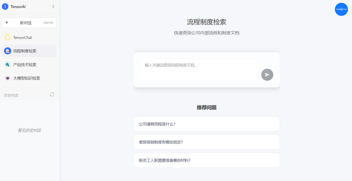 Through TensorChat, users can start a conversation with TensorAI of TENSORTEC at any time. Good noon. How can I help you? Behind this warm greeting lies TensorAI's service attitude of always being on standby. Whether it is process and system search, quick access to company systems and documents; Whether it is product technology search or obtaining product technical document information, it can all be accomplished efficiently. Users only need to input any content they want to ask and they will receive timely and accurate responses.